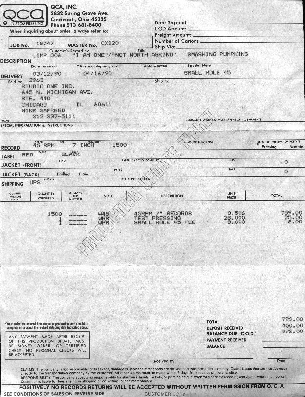 Invoice/Production Update Ticket for the pressing of the first 7″ vinyl single of the Smashing Pumpkins. It is pretty sure that there are in total 3 testpressings, 2 are still in the band’s posession and only 1 is invoiced.