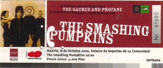 Machina II / The Friends And Enemies Of Modern Music Item Details Item Category: Print Artist: Smashing Pumpkins Format: Ticket Release Type: Tour Release Date: 2000.10.08 Release Country: Spain Manufacture Country: Spain Package: Paper Label: -None- Release Code: UPC: Matrix Code: Other Code: RPM: Amount Pressed: Unknown Additional Information Item Art
