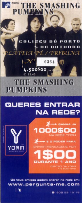 Machina II / The Friends And Enemies Of Modern Music Item Details Item Category: Print Artist: Smashing Pumpkins Format: Ticket Release Type: Tour Release Date: 2000.10.05 Release Country: Portugal Manufacture Country: Portugal Package: Paper Label: -None- Release Code: UPC: Matrix Code: Other Code: RPM: Amount Pressed: Unknown Additional Information Item Art