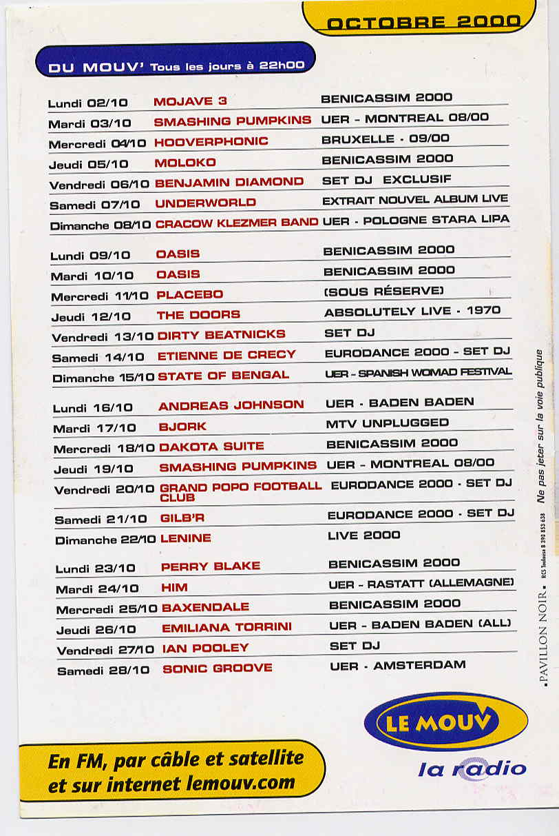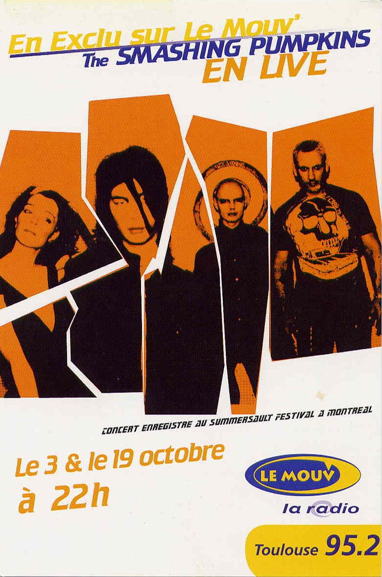 Flyer for the announcement of 2 broadcasts on 2000/10/03 22:00 and 2000/10/19 22:00 of the 2000/08/12 Montreal Canada concert. Broadcasted on the French radio station Le Mouv.