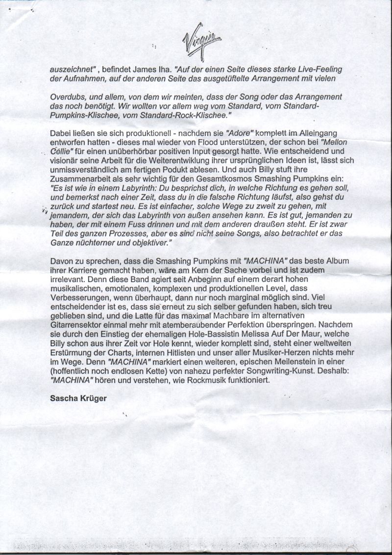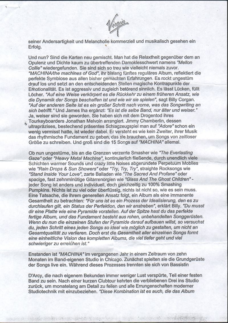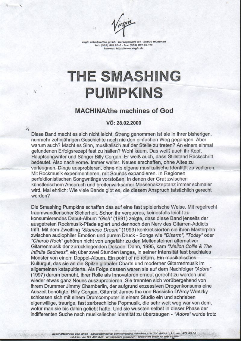 Machina was originated during the last year over 10 months in the band-own studio in Chicago. First they played in live the base frames of the songs. During this process they parted from their bassist D’Arcy, she was getting less inclined of the idea being a fixed part of a band. …. (some facts about the studio process working on an album. In difference to Adore this time again with Flood and some facts about the advantages working with someone outstanding of the band).