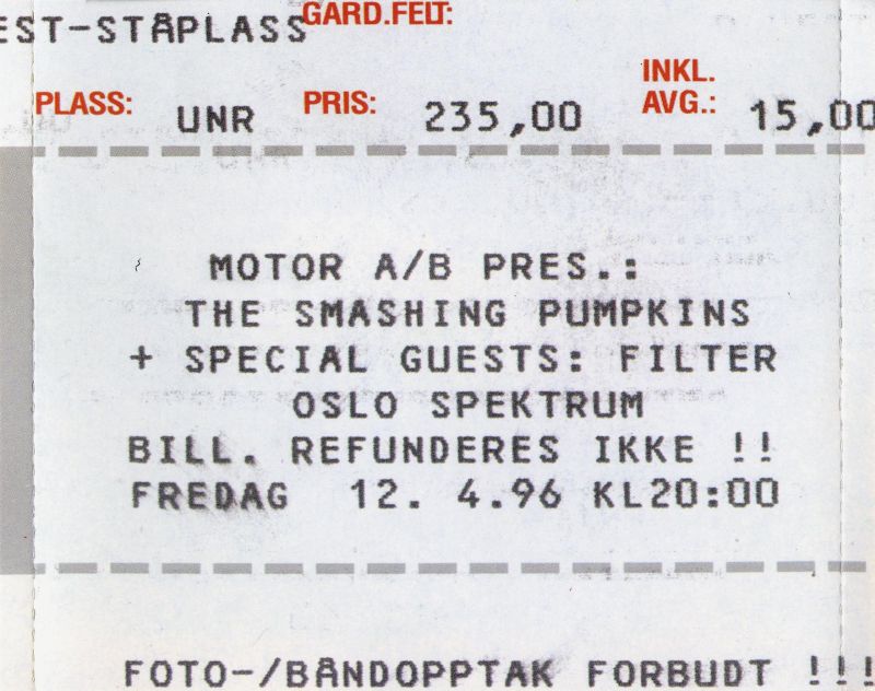 Mellon Collie And The Infinite Sadness Item Details Item Category: Print Artist: Smashing Pumpkins Format: Ticket Release Type: Tour Release Date: 1996.04.12 Release Country: Norway Manufacture Country: Norway Package: Paper Label: -None- Release Code: UPC: Matrix Code: Other Code: RPM: Amount Pressed: Additional Information Item Art