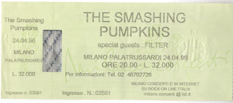 Mellon Collie And The Infinite Sadness Item Details Item Category: Print Artist: Smashing Pumpkins Format: Ticket Release Type: Tour Release Date: 1996.04.24 Release Country: Italy Manufacture Country: Italy Package: Paper Label: -None- Release Code: UPC: Matrix Code: Other Code: RPM: Amount Pressed: Additional Information Item Art