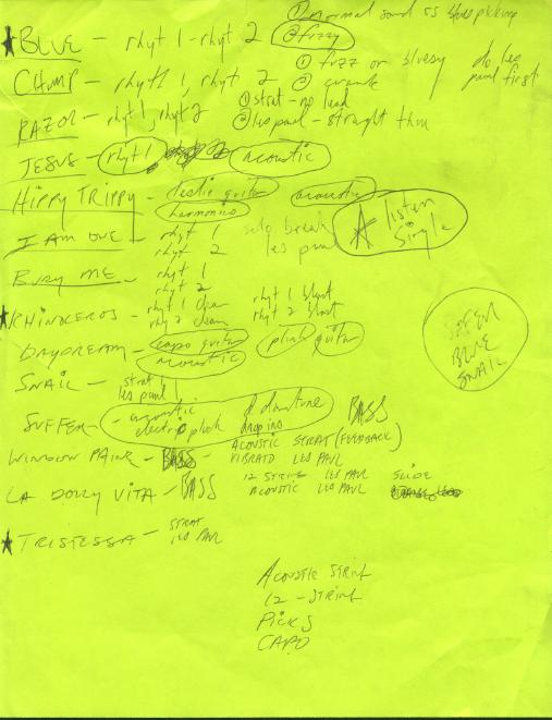 Very interesting piece of paper, most probably containing studio notes. Note the new track Hippy Trippy on this paper on the left side. This track has not yet surfaced. One of our sources however states there is a cassette containing this track.