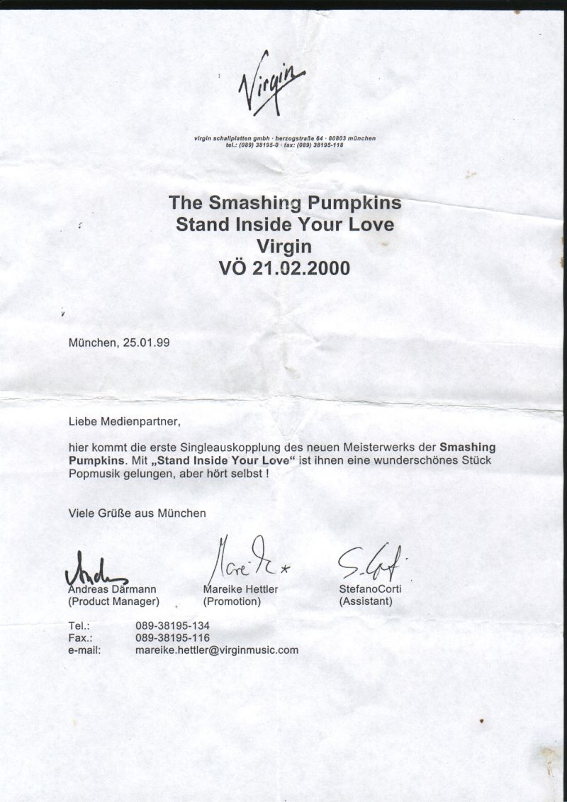 This press release came with the Stand Inside Your Love UK promo cardsleeve, DPRO 14932. This cardsleeve had no sticker on the front, unlike some. As a mistake on the release (as you can see), it is dated as 25.01.99 instead of 25.01.2000. The full translation is:
